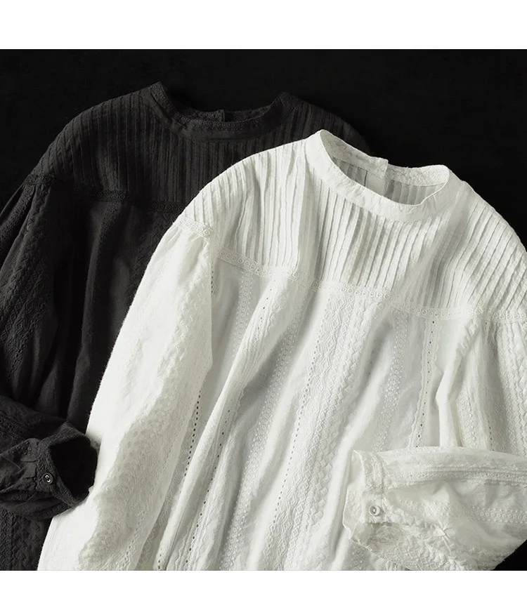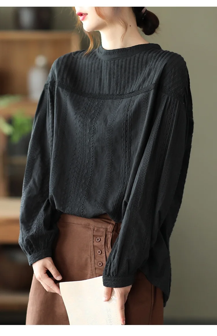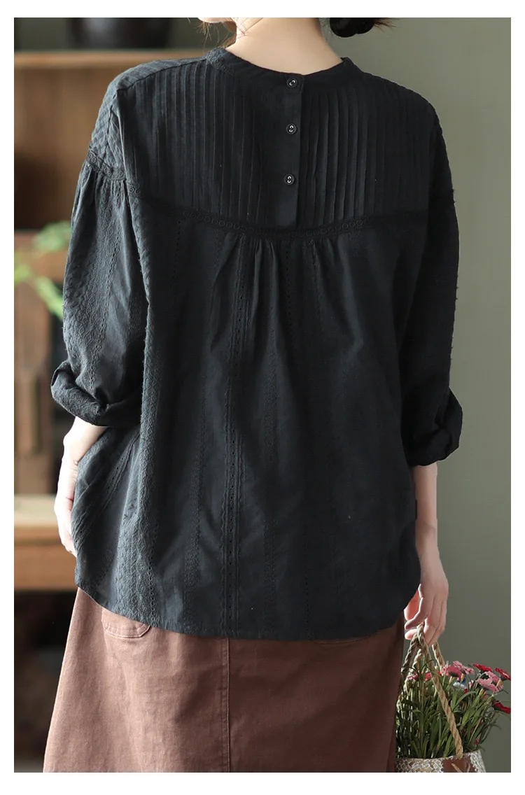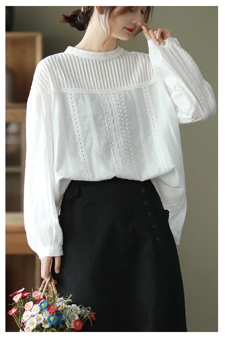 This blouse features intricate hollow-out embroidery for a refined, designer-inspired look. The stand collar adds a modern twist to the classic silhouette. Its pullover style ensures easy wear and a relaxed fit that flatters most body types.