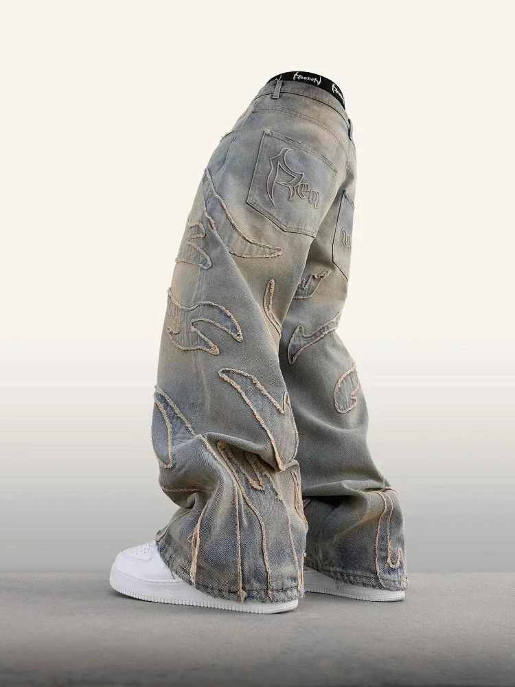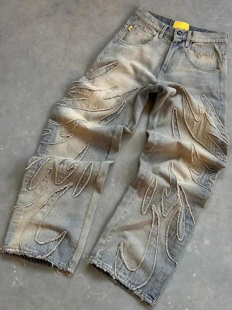 Step into bold streetwear with the American Y2K wide-leg cotton denim trousers. Inspired by early 2000s fashion, these jeans combine a casual retro look with modern comfort. Featuring distressed wash effects, patchwork details, and a low-waist cut, they are the perfect piece for creating a trendy outfit that stands out in any season.