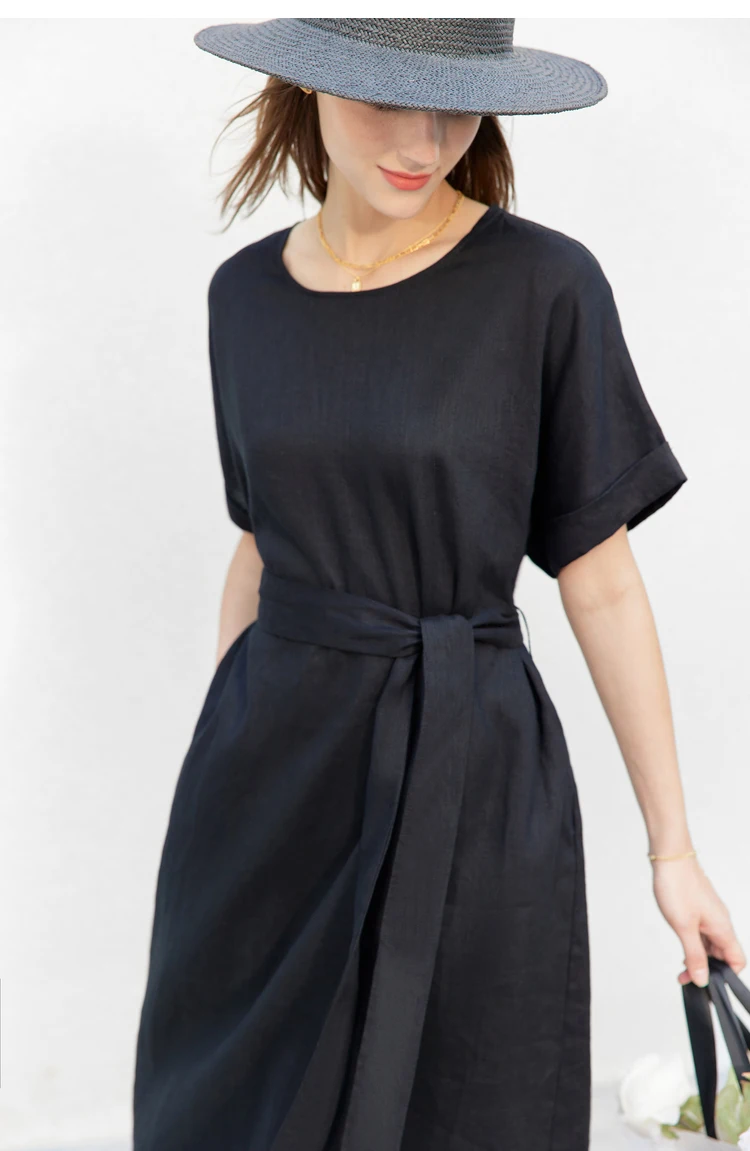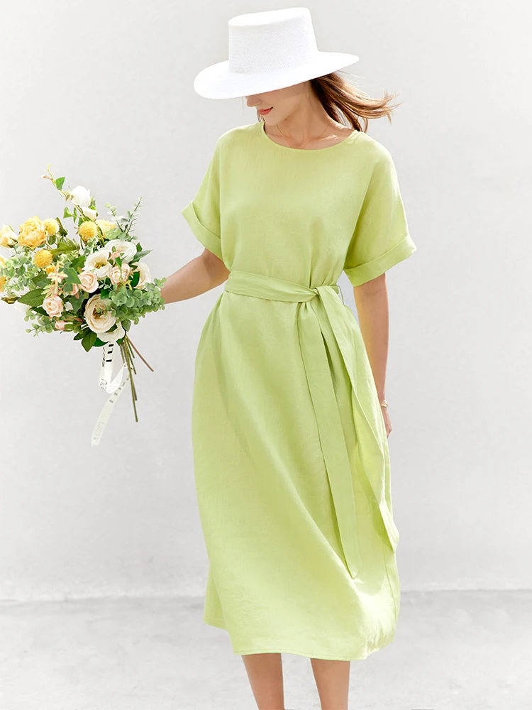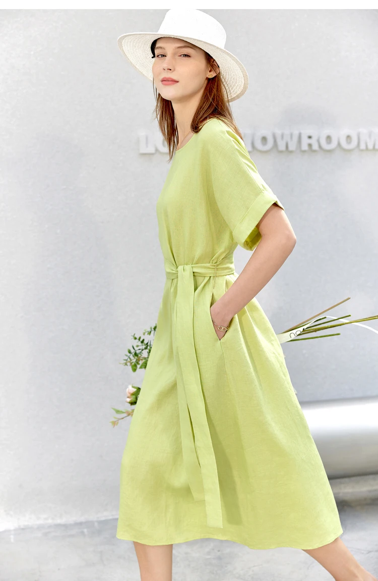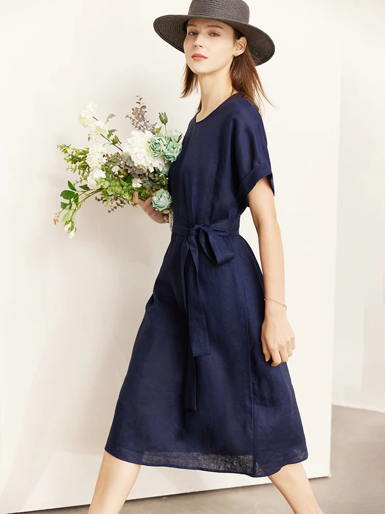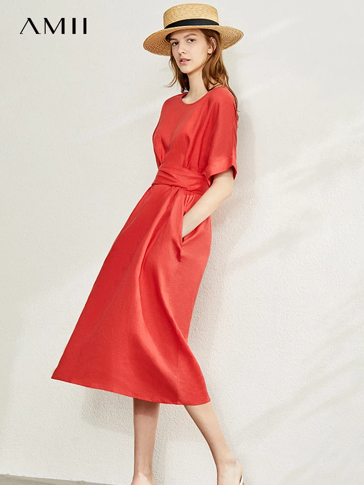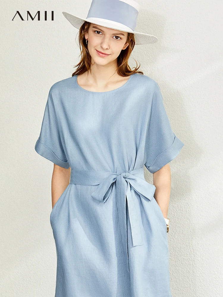 AMII Minimalist women 100% Linen O-Neck Summer Dress