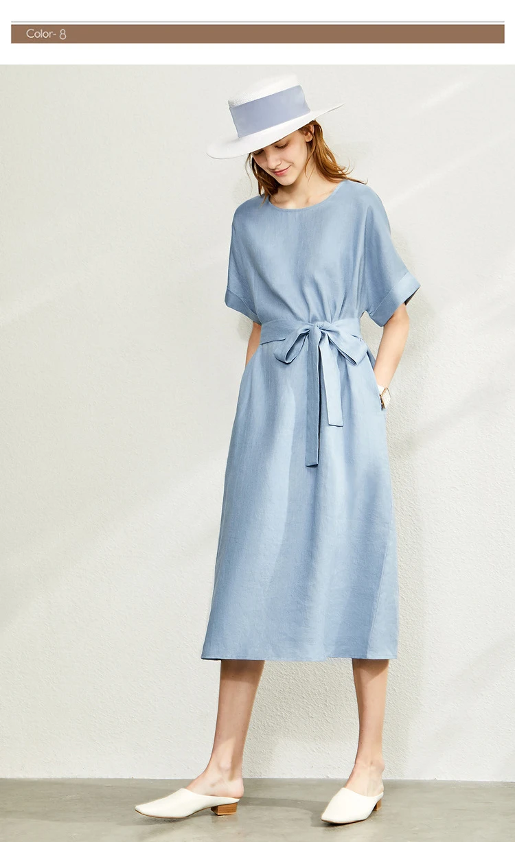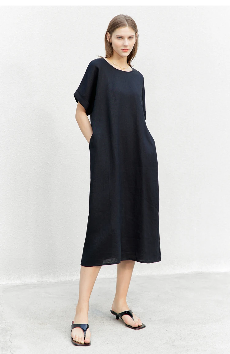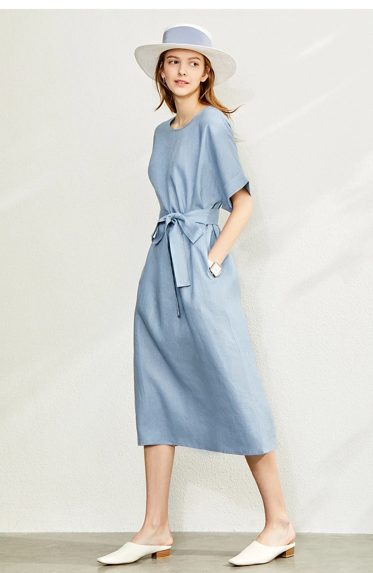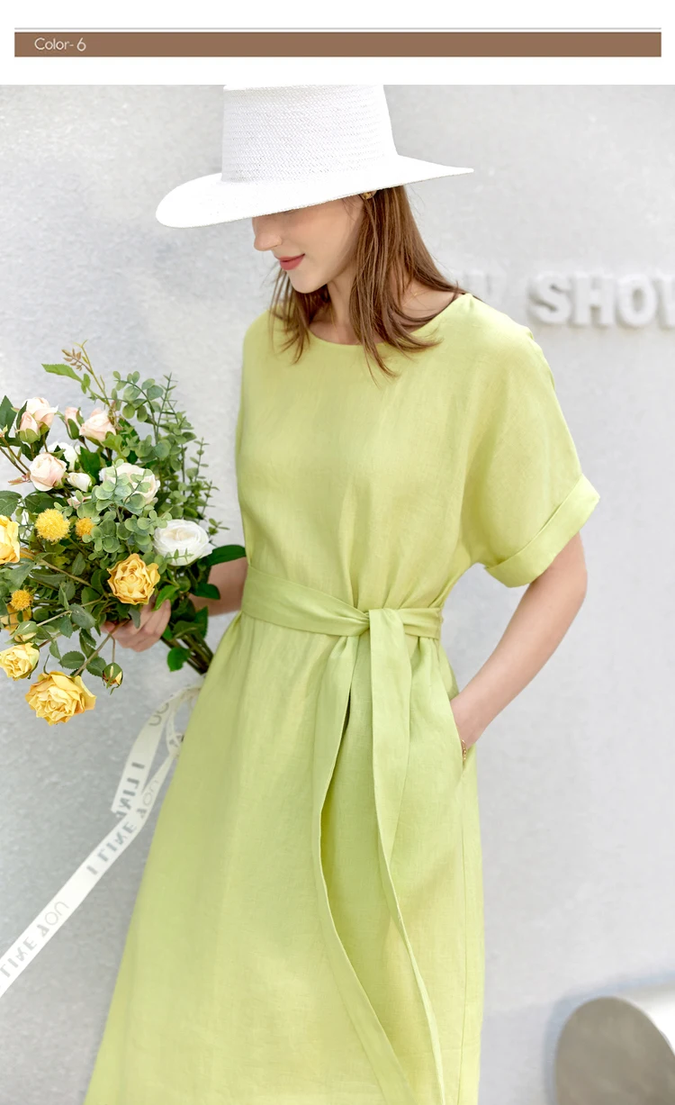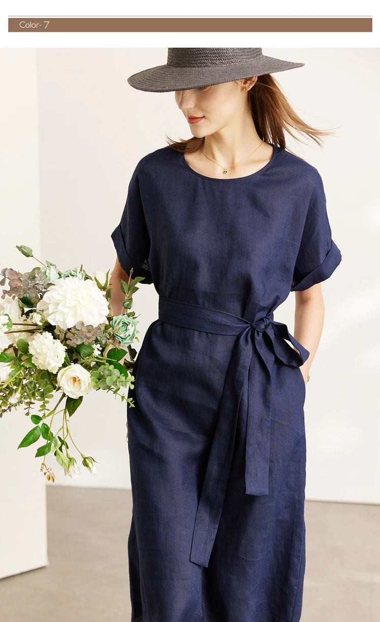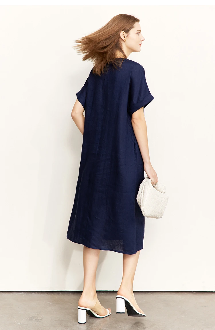 AMII Minimalist women 100% Linen O-Neck Summer Dress