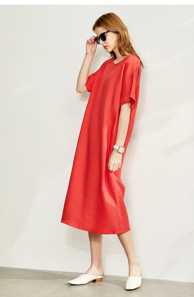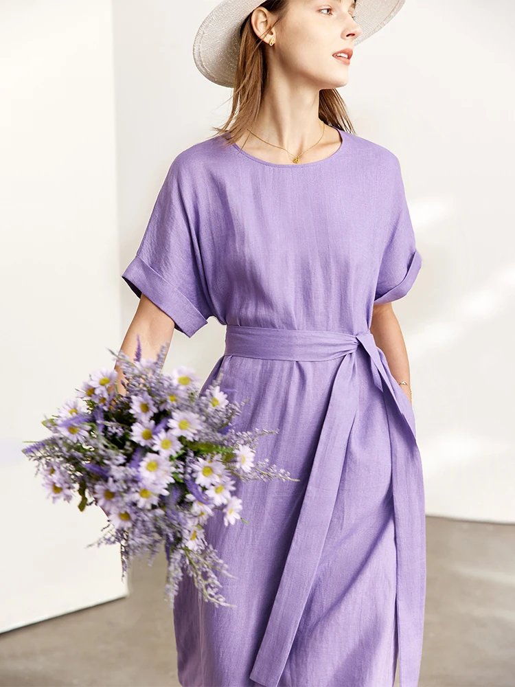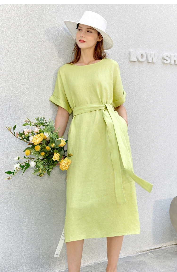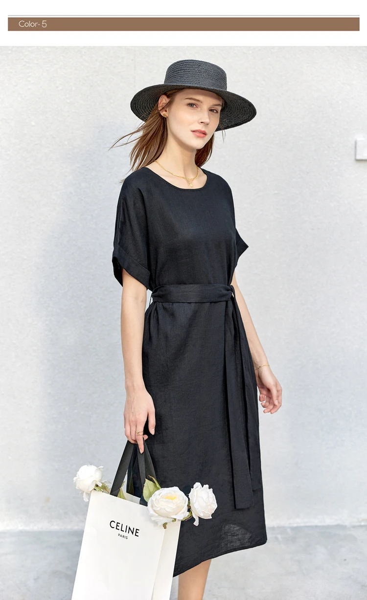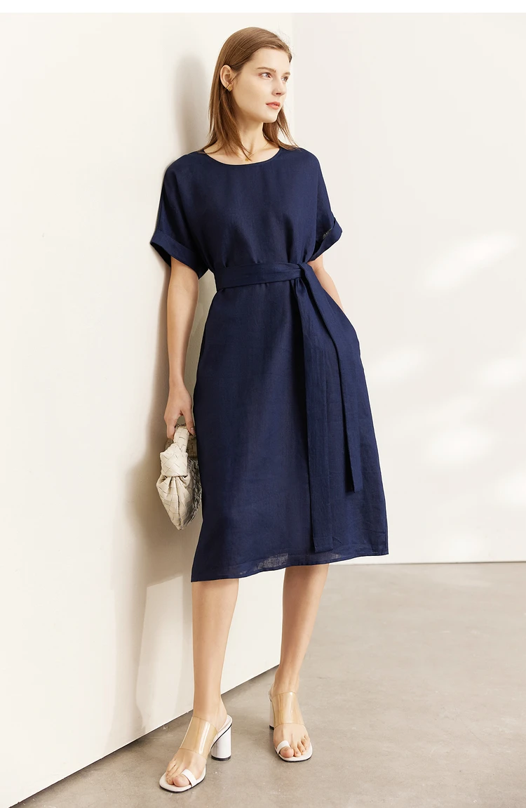 AMII Minimalist women 100% Linen O-Neck Summer Dress