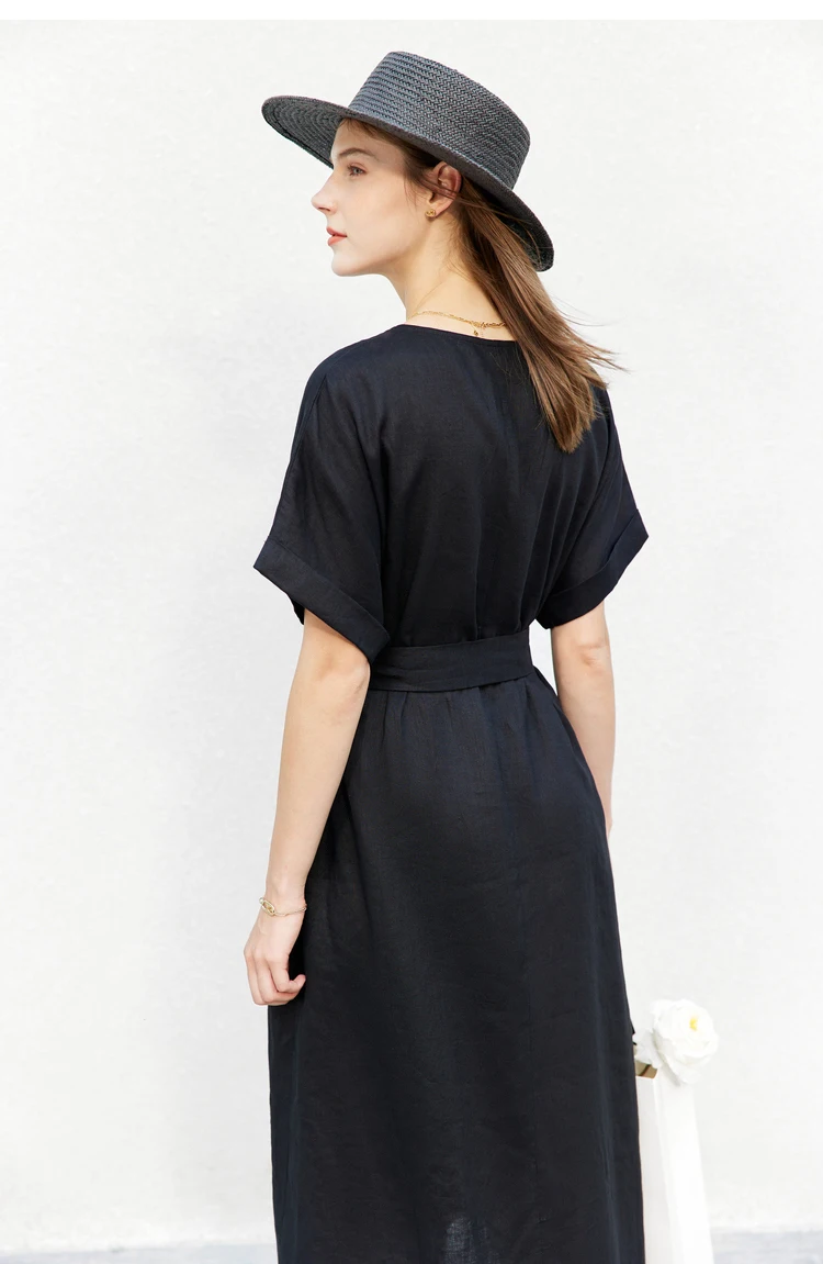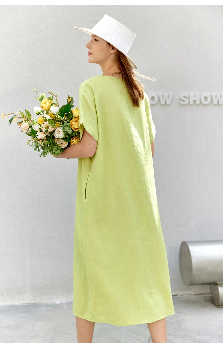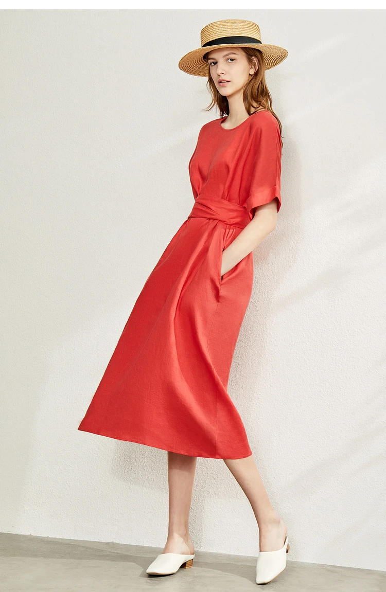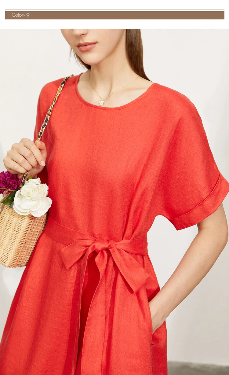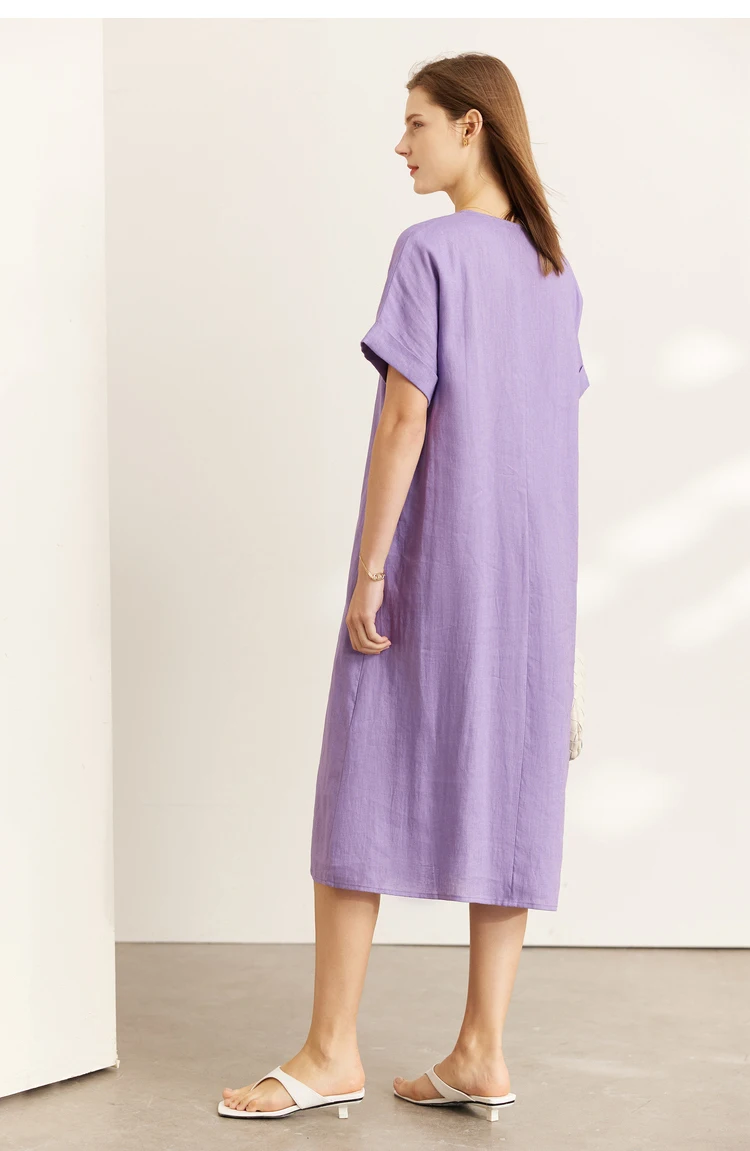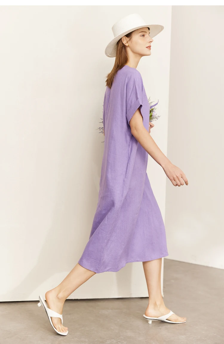 AMII Minimalist women 100% Linen O-Neck Summer Dress