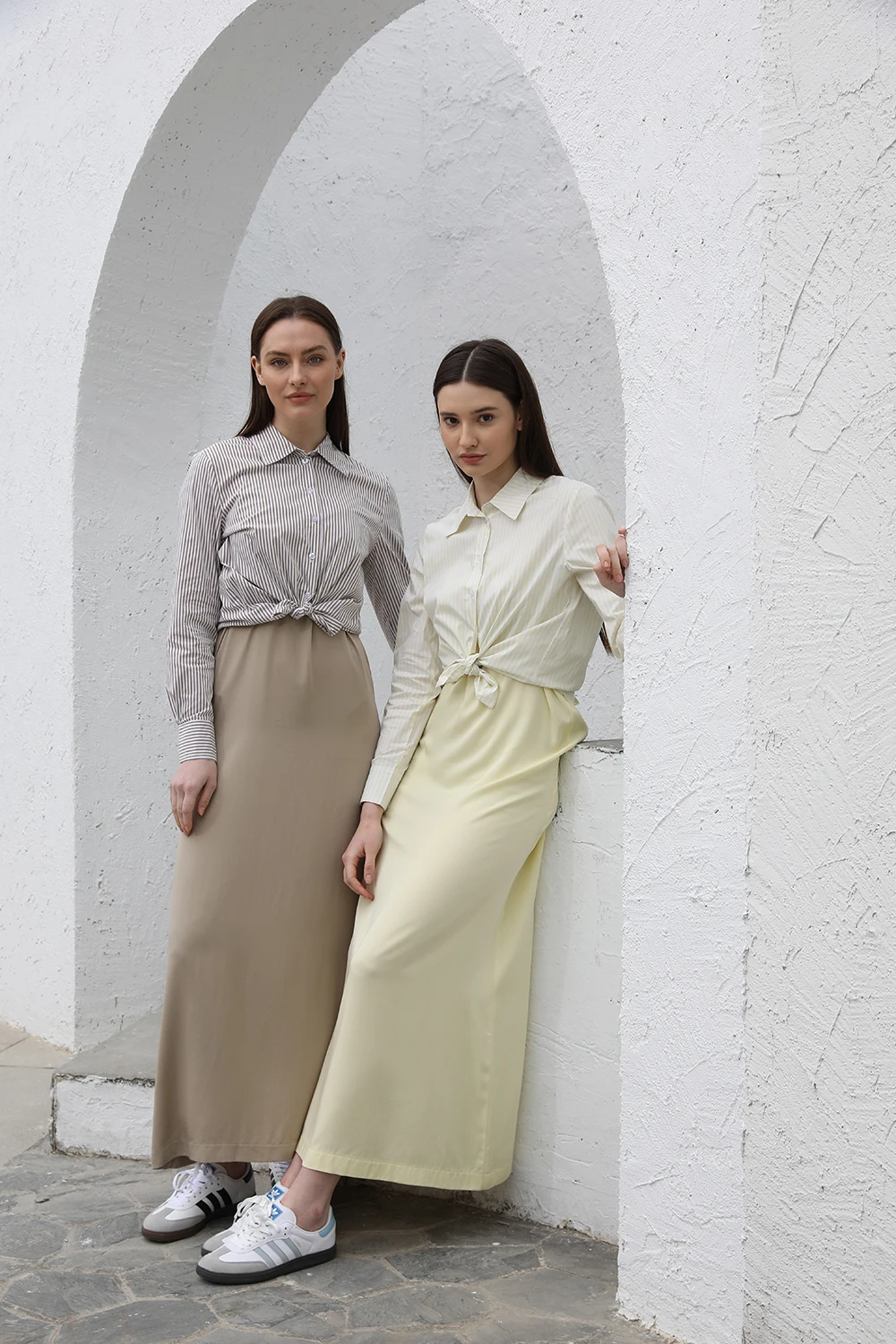 Pair the dress with sandals or low heels for a casual day look. Furthermore, add a light cardigan or jacket for cooler days. The neutral striped design allows for versatile accessorizing with scarves, belts, or jewelry.