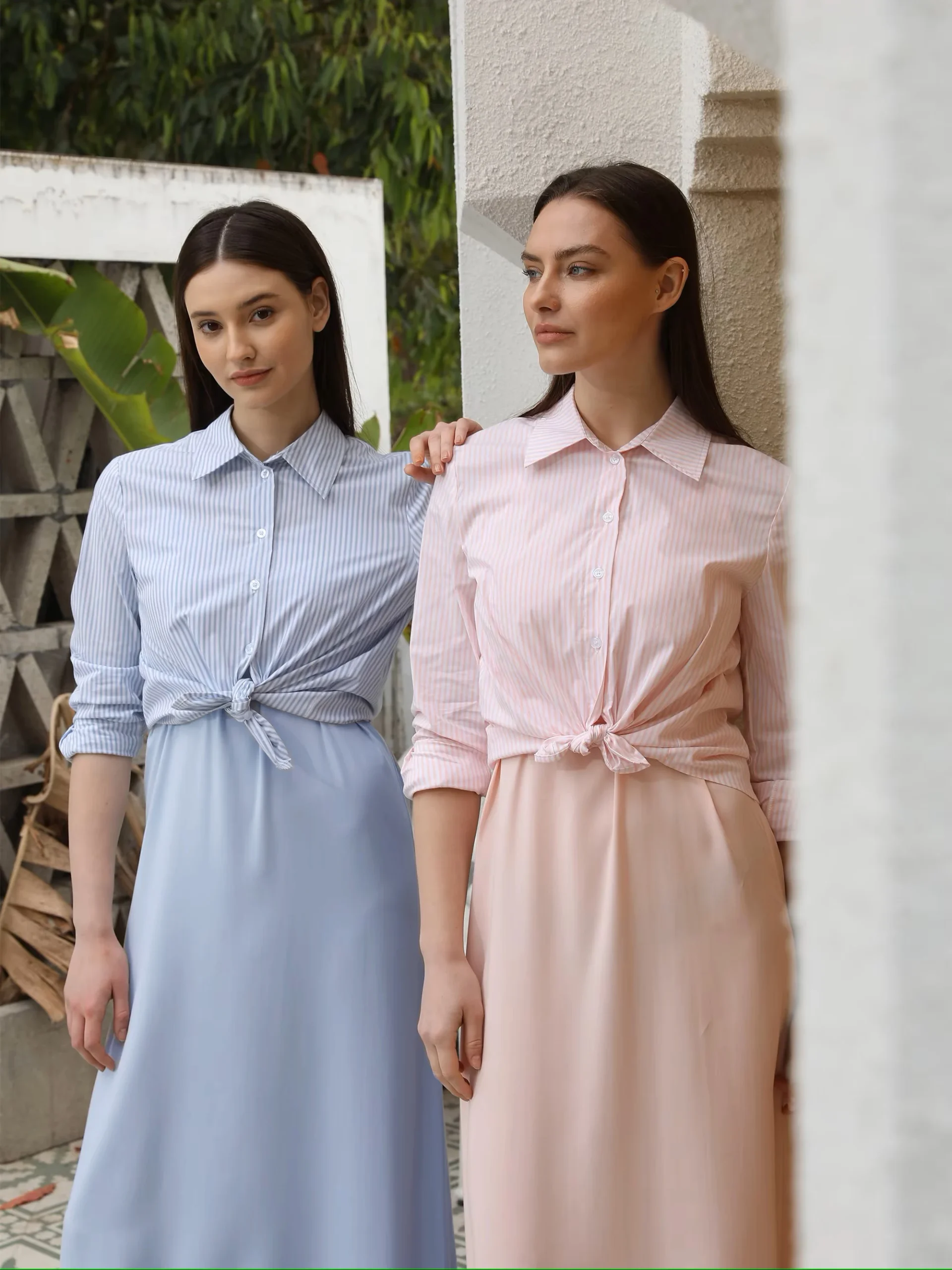 The turn-down collar, button decoration, and striped pattern add subtle design elements to enhance the overall aesthetic. In addition, the long sleeves offer coverage while keeping the style modern and classic.