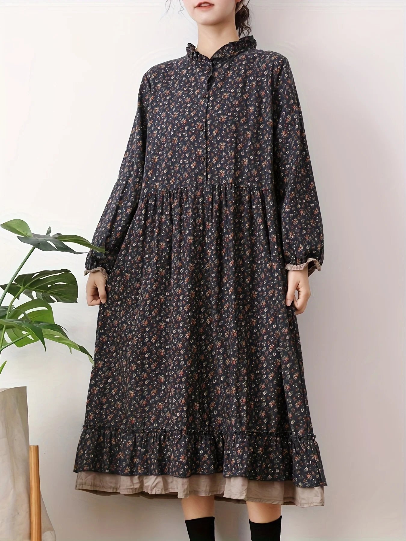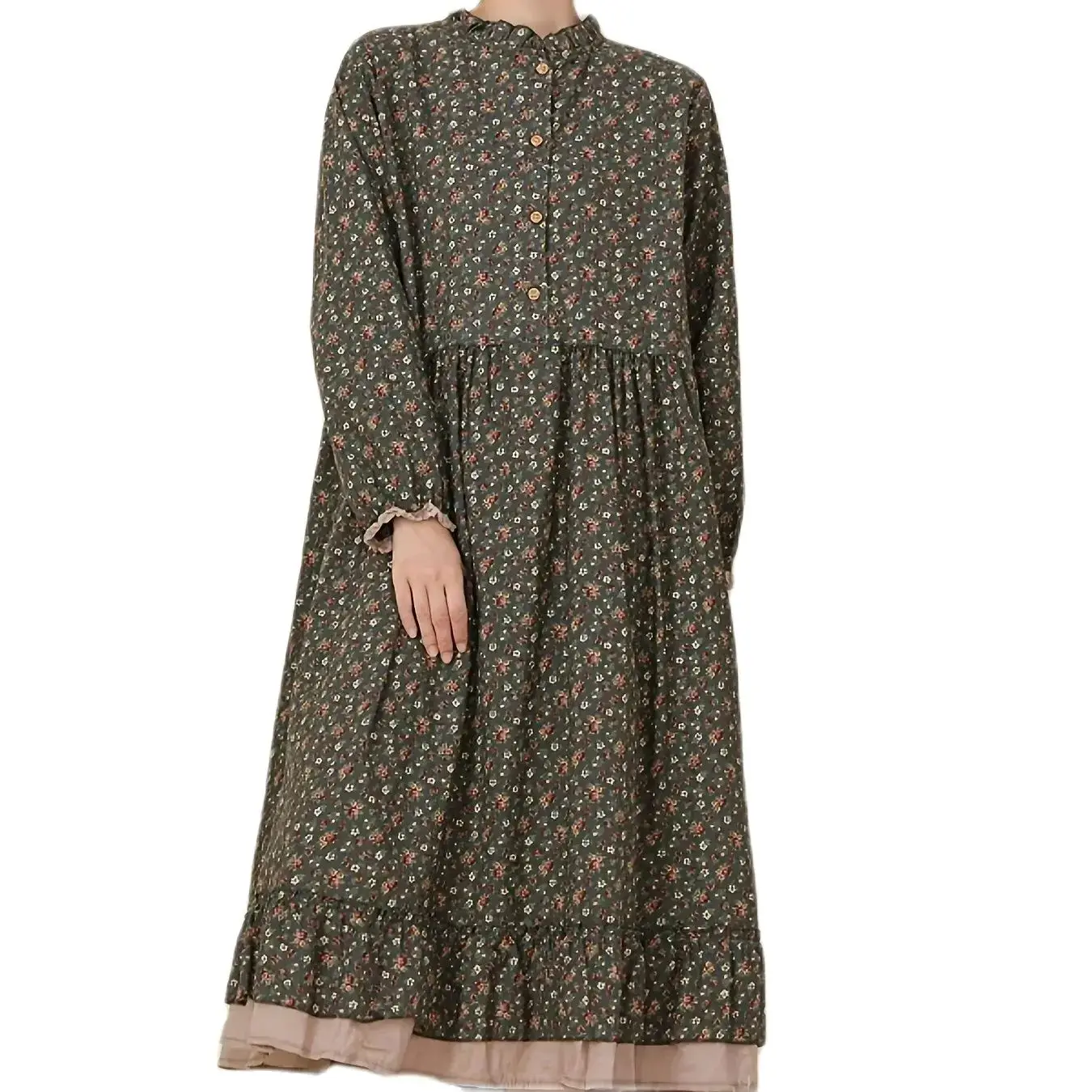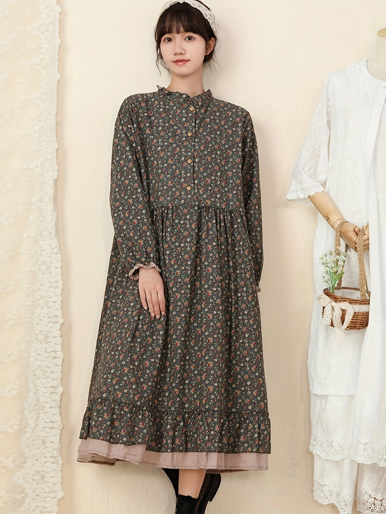 This Japanese-style A-line dress is perfect for the warmer months. Additionally, it is made from a soft cotton-linen blend, which is lightweight, breathable, and comfortable for all-day wear. The mid-calf length and loose fit ensure ease of movement, making it suitable for casual outings, vacations, or garden parties. Moreover, the tiered floral design adds a flowing and elegant silhouette, giving it a feminine and sophisticated look.
