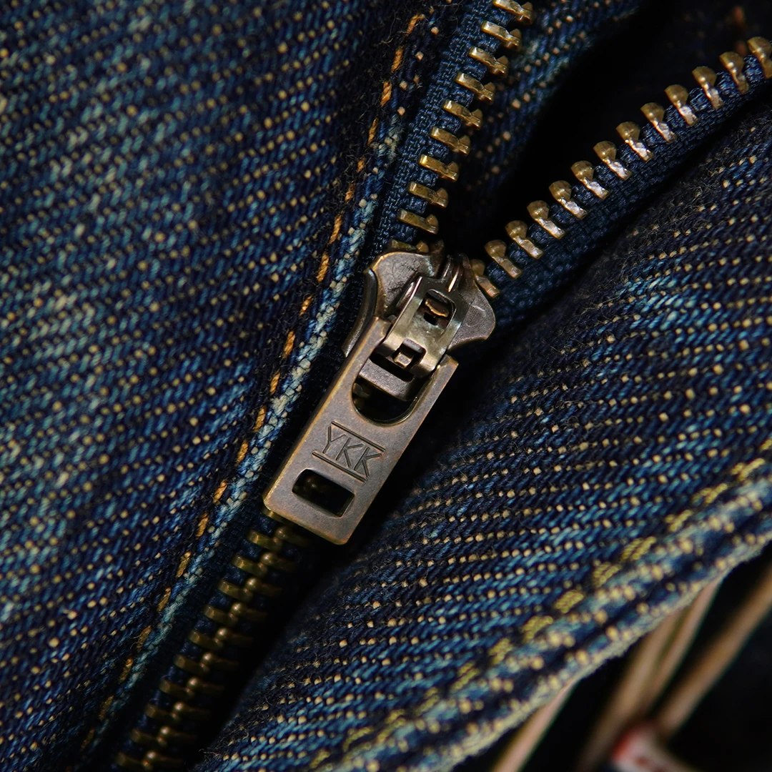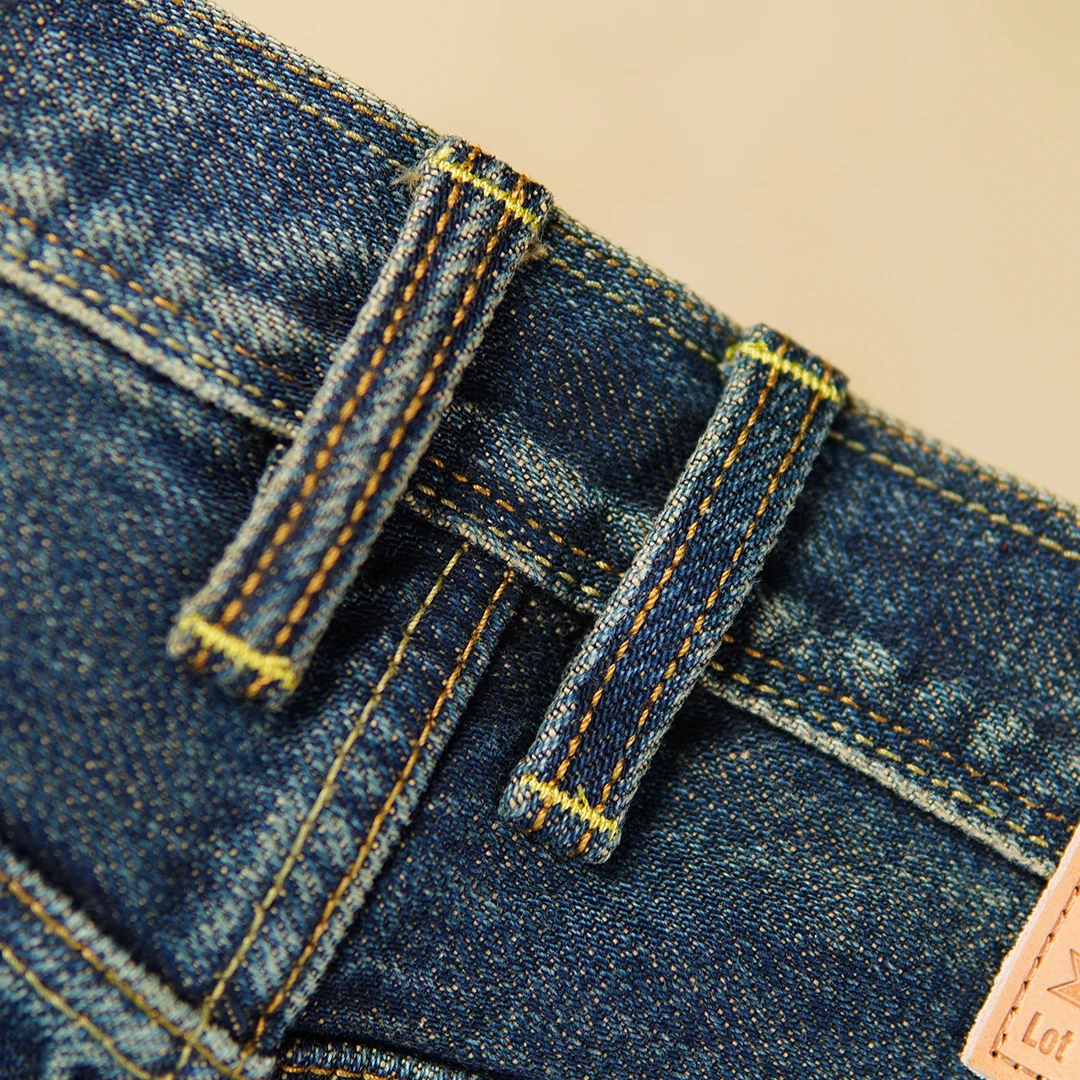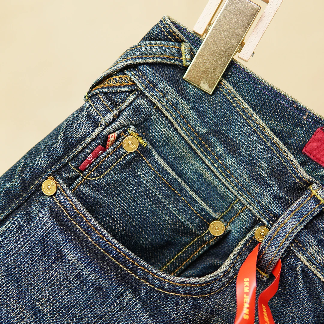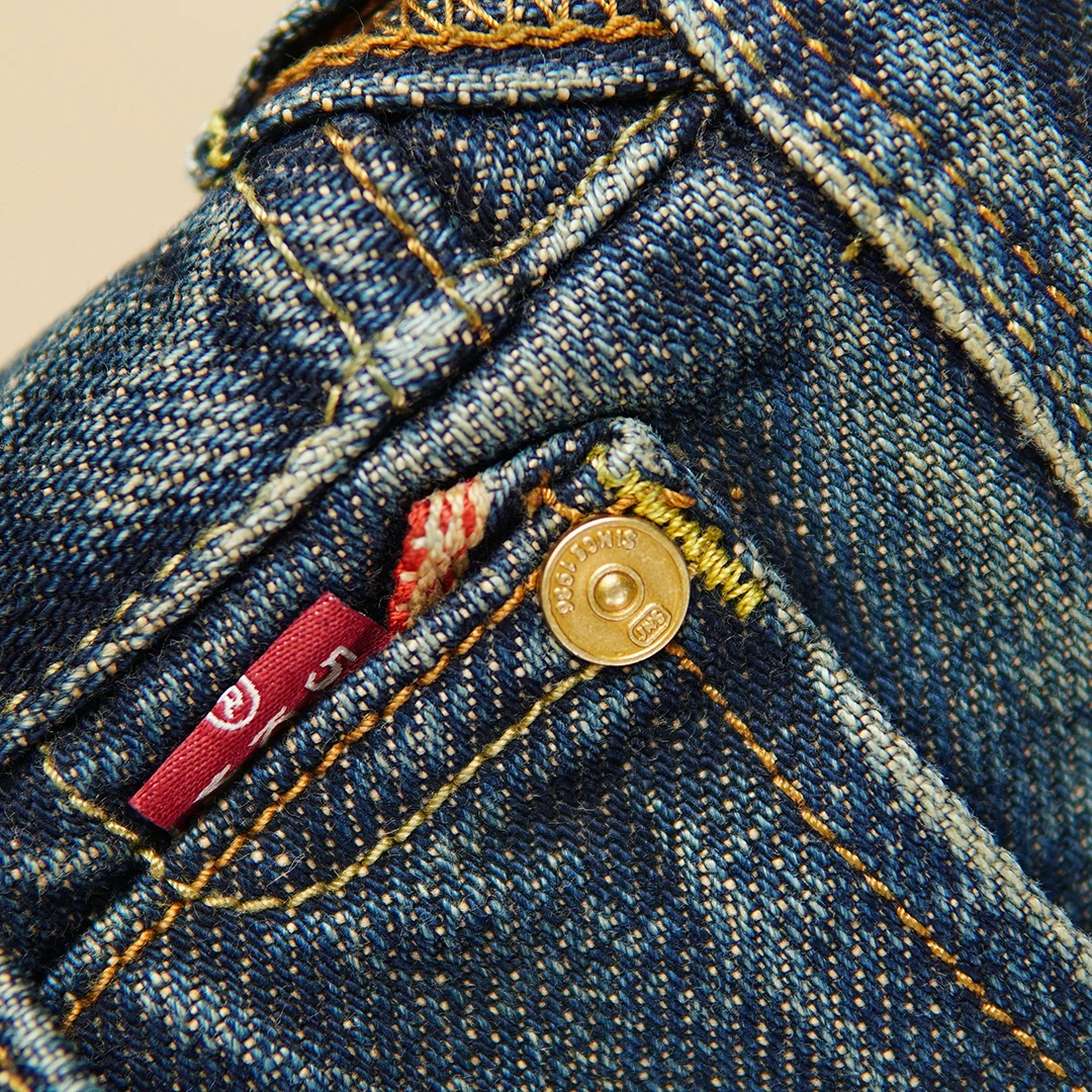Crafted from 100% natural cotton selvedge denim, these jeans ensure breathability while maintaining a strong, structured fit. The non-stretch material preserves their original shape, giving you a clean, classic silhouette. The medium wash adds a subtle vintage look, while the scratched detailing provides a worn-in, authentic edge.
