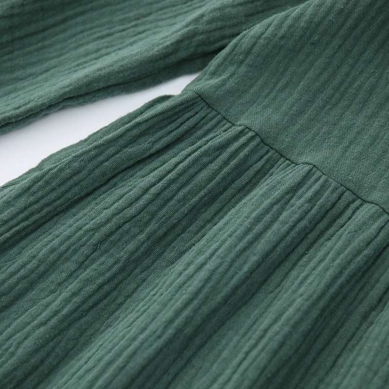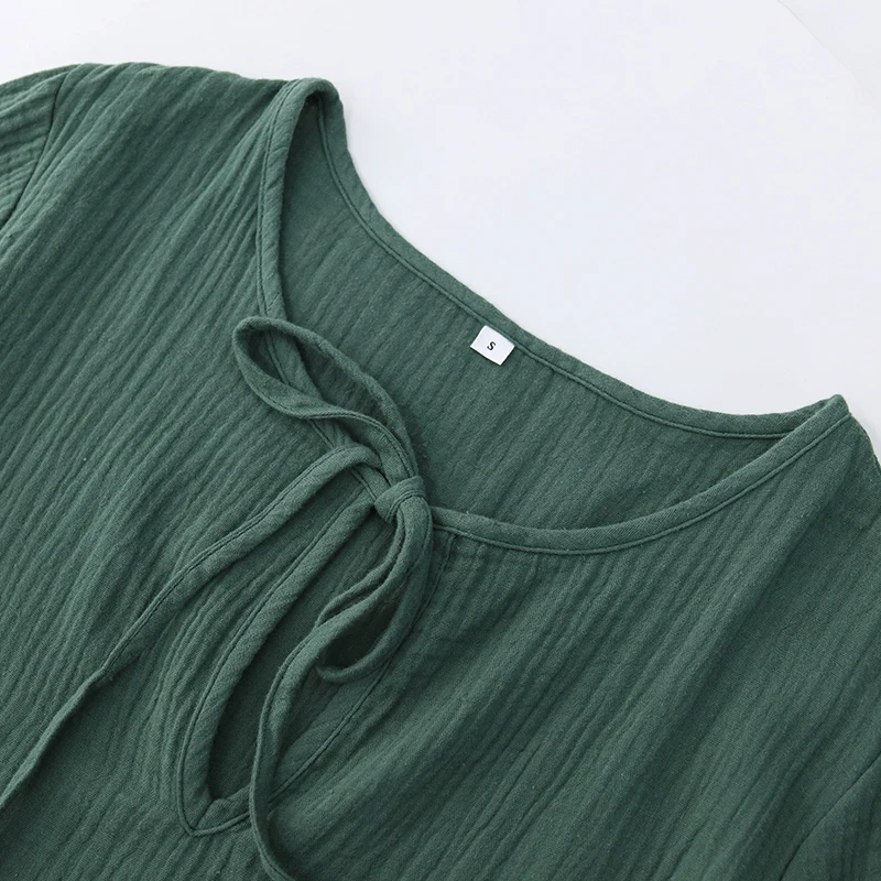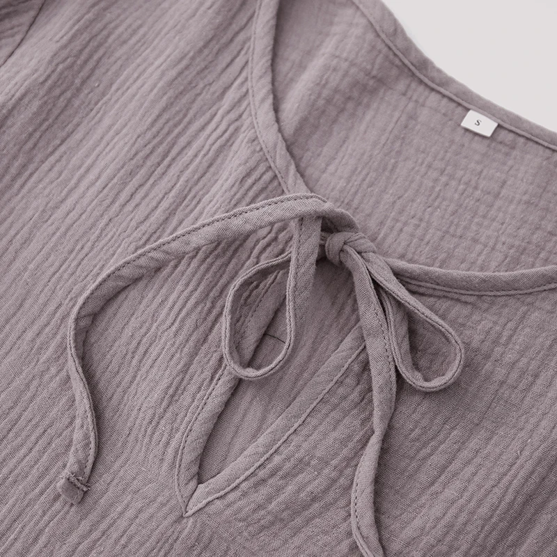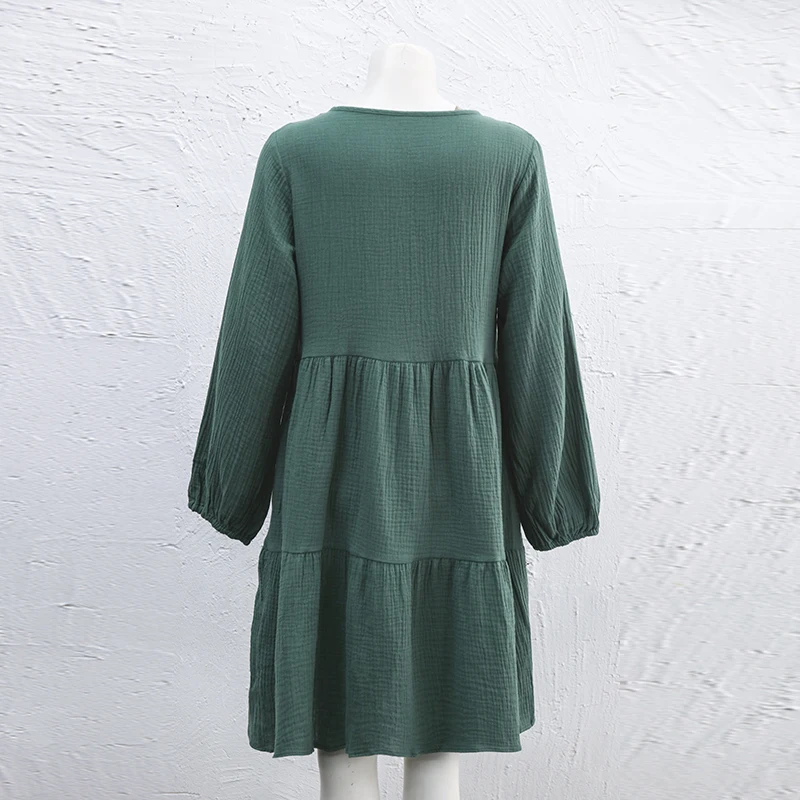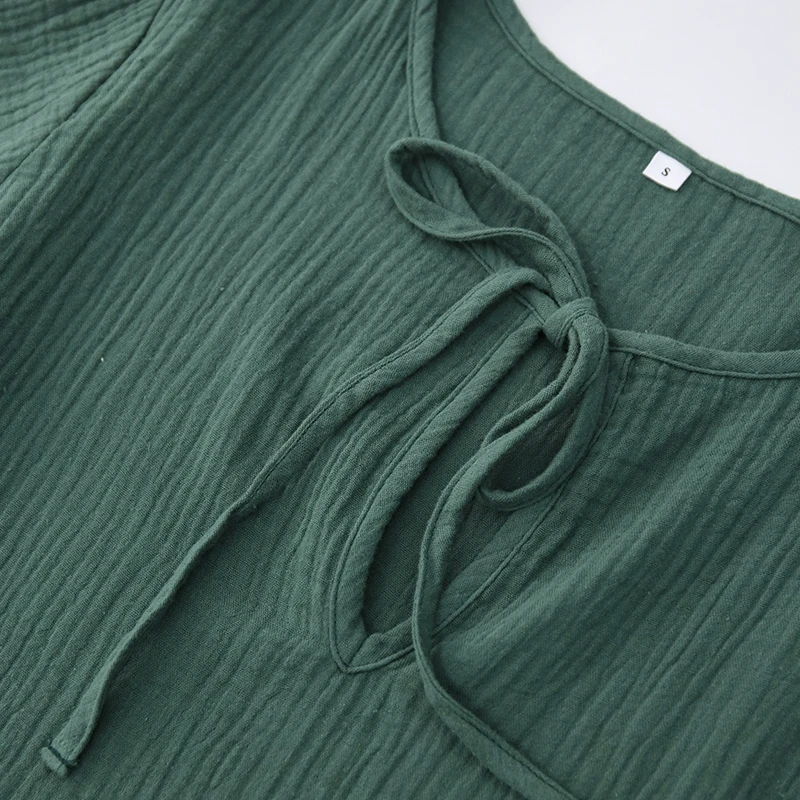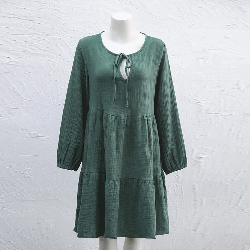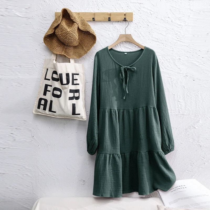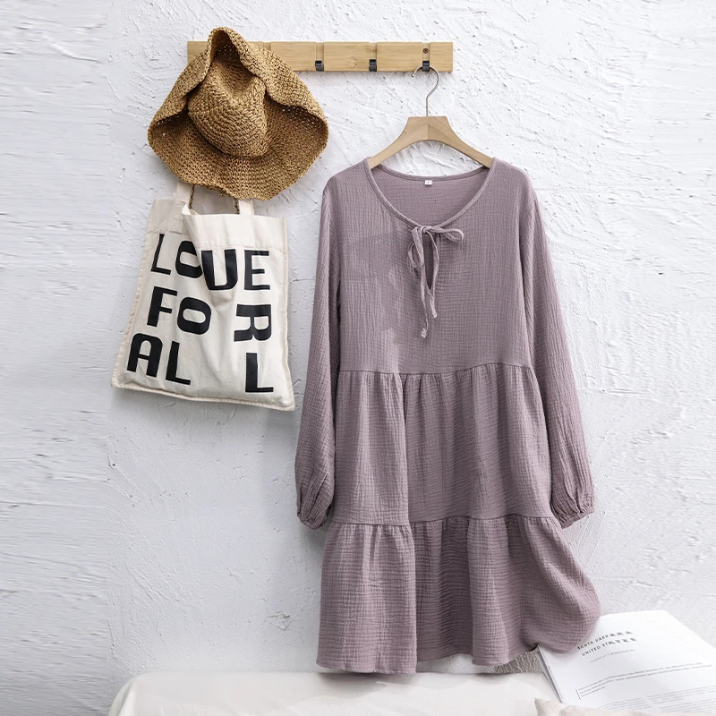 Muslin 100% Cotton Women Dress Loose Long Sleeve Lace-Up Boho Dresses Soild Vintage Streetwear Female Robe Hoilday Combination