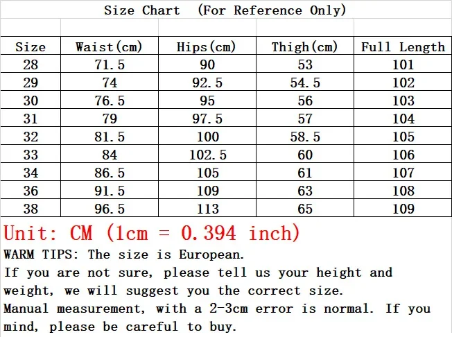 • Sizes follow Chinese measurements. For example, size 32 equals a 32-inch waist (about 81.5 cm).