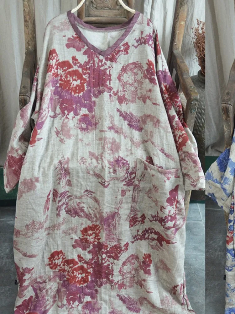 Featuring a V-neckline and loose-fit silhouette, this dress reflects subtle Chinese-inspired aesthetics. Additionally, the printed pattern adds a unique artistic touch to your wardrobe.