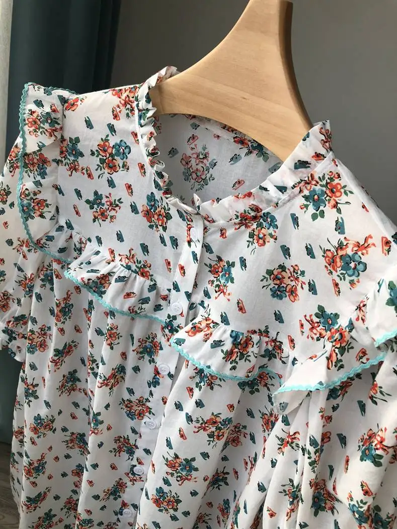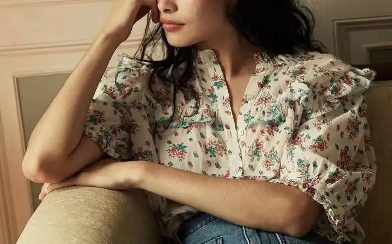 Stay stylish and comfortable with this women’s 100% cotton printed blouse. Designed for spring and summer, this blouse features a prairie-chic style with short puff sleeves. Its regular fit and V-neckline make it perfect for casual outings, brunches, or work-from-home days.