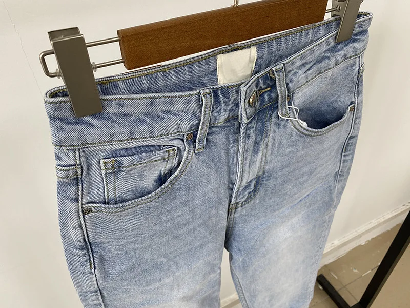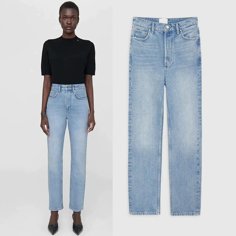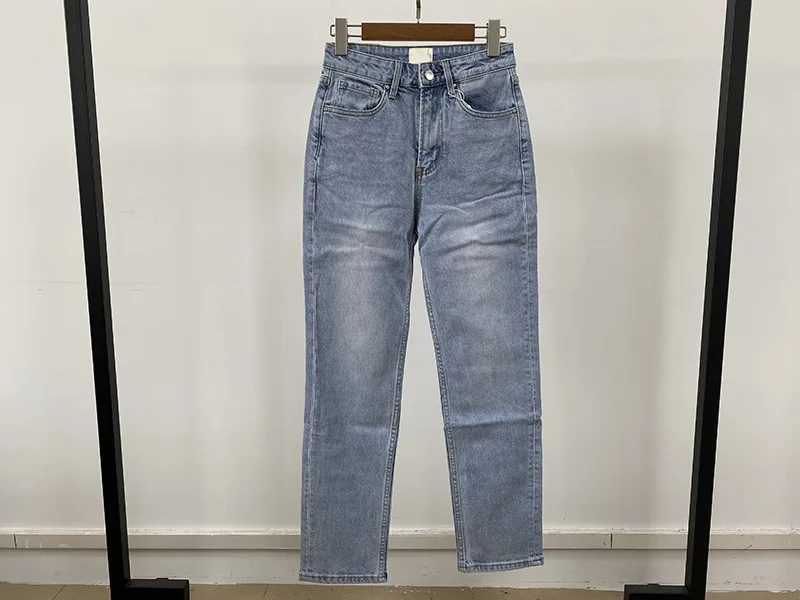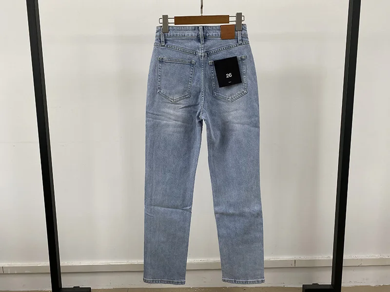 Made from premium cotton denim, the jeans are soft, breathable, and long-lasting. The high-waist design provides a secure and flattering fit. In addition, the slim straight cut enhances your natural silhouette, creating a sleek and modern look. The light wash adds a timeless touch that matches a wide variety of tops.