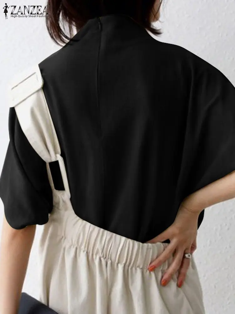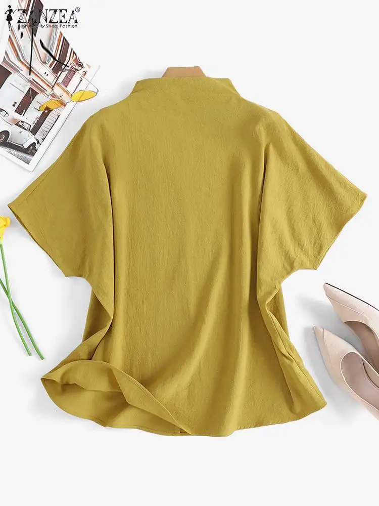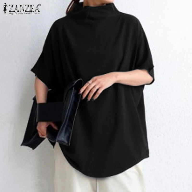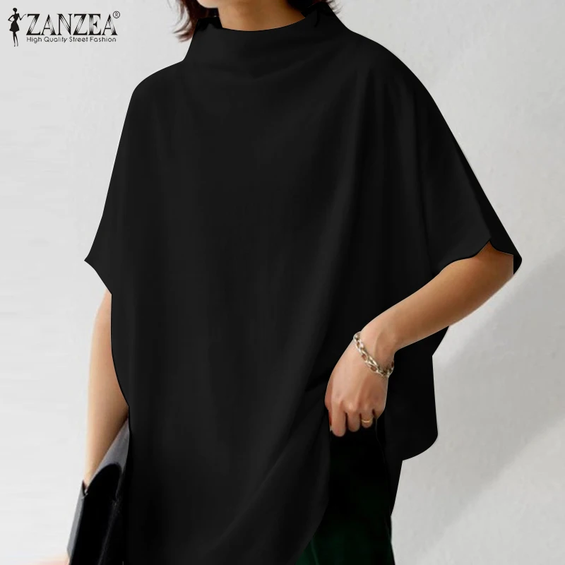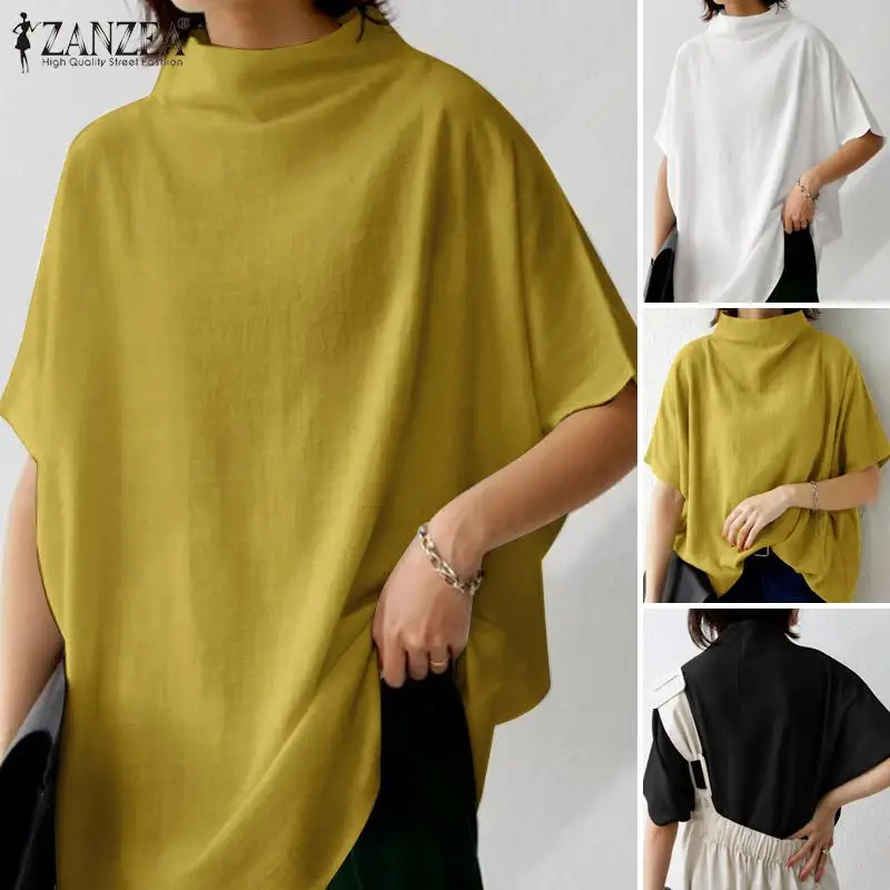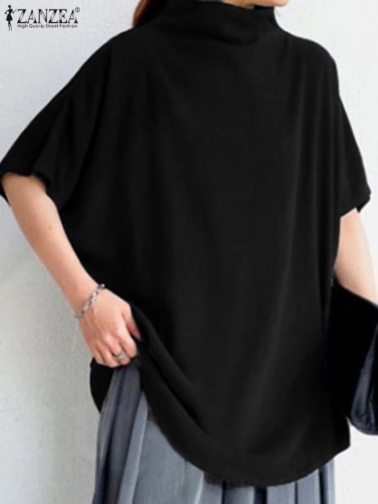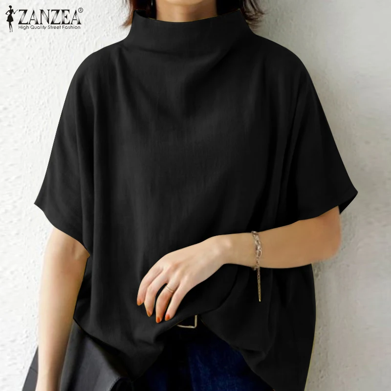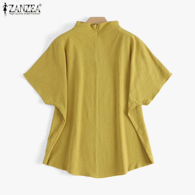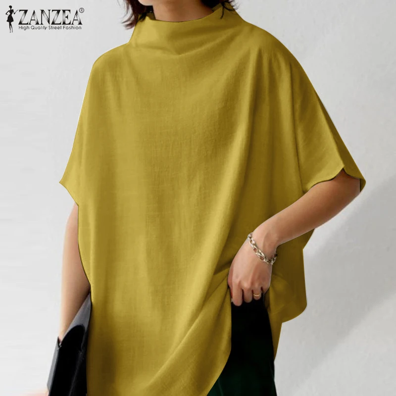The blouse features a turtleneck collar and short sleeves, giving it a refined yet relaxed look. Meanwhile, the solid color and back zipper make it easy to style with various outfits. Available in black, white, and yellow, this pullover top offers versatility for casual, office, or semi-formal occasions. Furthermore, the oversized cut creates a Bohemian and retro vibe, making it ideal for multiple fashion styles.