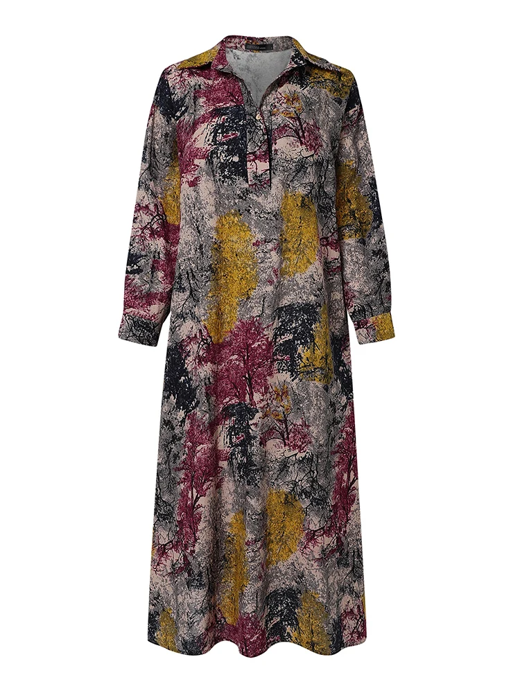 The lapel-style turn-down collar adds sophistication, making this dress appropriate for both leisure and semi-formal events. In addition, the button-down front and cuffs bring functional style details.