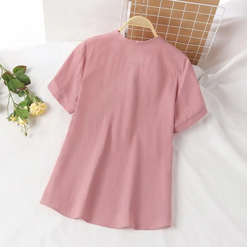 Featuring a classic V-neckline, this blouse adds a touch of elegance while remaining simple and versatile. The short sleeves and straight pullover design provide a relaxed yet flattering fit, making it suitable for middle-aged women who value both style and comfort.
